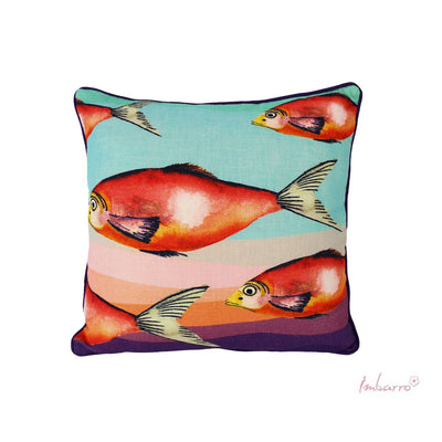 Colores frescos, hermosos peces de acuarela, algodón tejido a mano y acabado con un ribete lila.