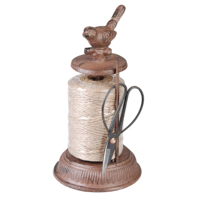 Soporte de hilo de hierro fundido marrón antiguo con tijeras.