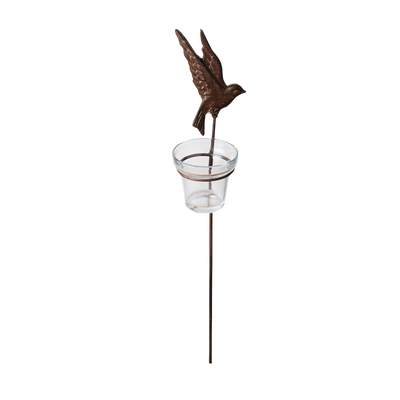 Aunque los pájaros suelen alegrar el jardín con su canto, estos pájaros proporcionan un espectáculo atmosférico. El vaso de cristal protege la vela del viento. Estos pájaros decorativos con estaca de hierro fundido están moldeados a mano individualmente según la antigua tradición y artesanía.