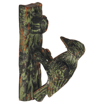 Este aldaba tradicional de hierro fundido tiene un pájaro carpintero que martilla un tronco para abajo, y ha sido moldeado a mano según la tradición y la artesanía ancestrales.